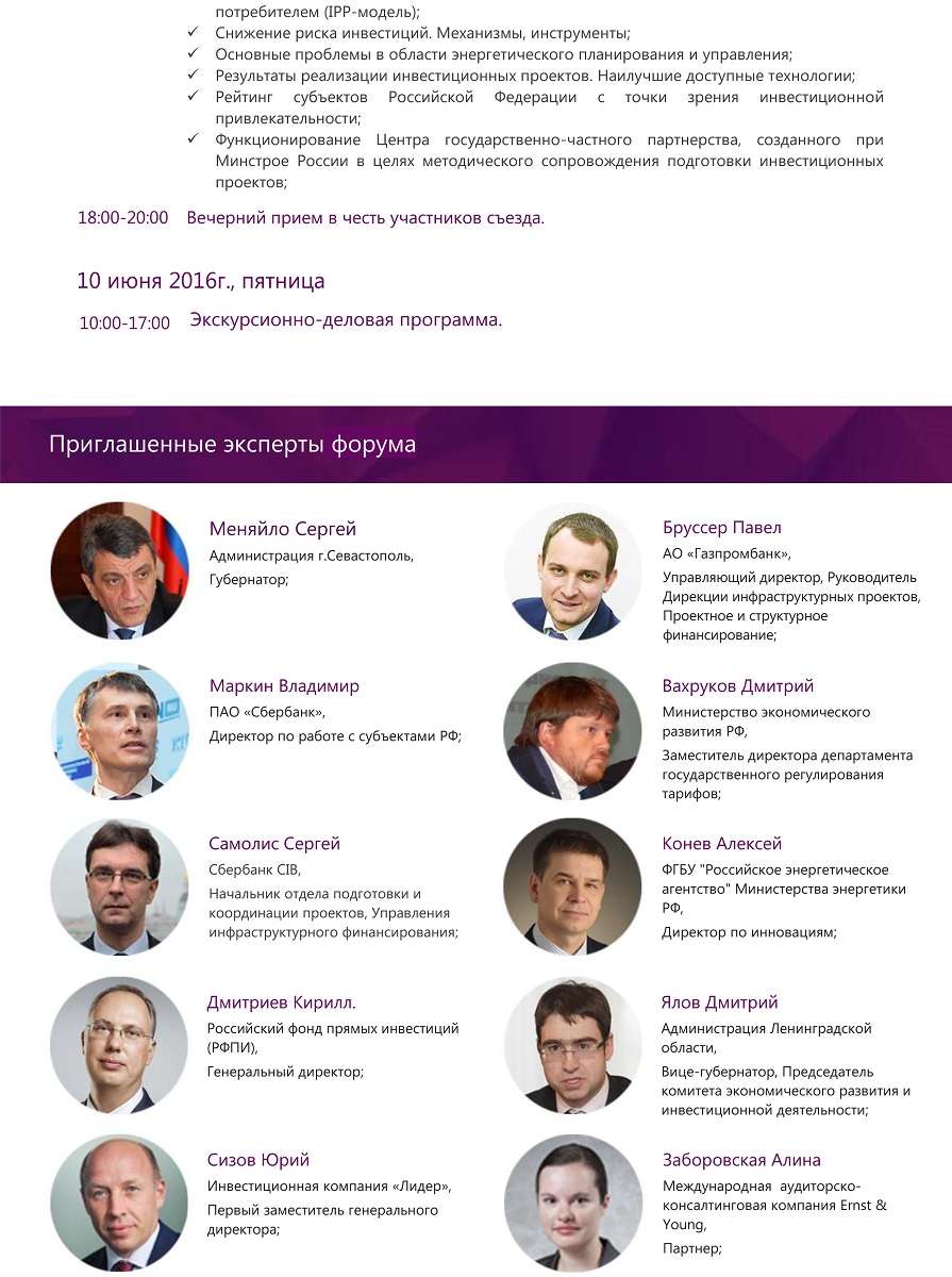 Формат мероприятия соответствует международным образцам организации, что позволяет получить максимальную пользу и комфорт от встречи, легко найти ответы на любые интересующие вопросы, а так же найти новых надежных друзей. Высокий статус мероприятия, актуальность обсуждаемых вопросов, широкий круг участников станут новым стимулом для развития инвестиционных программ.